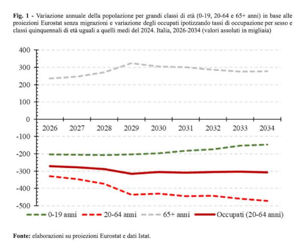 Quelle appena esposte sono considerazioni sostanzialmente in linea con quanto già emerso in passate valutazioni (Gesano e Strozza 2011; 2019) ed anche in recentissime analisi (Galli et al. 2025), volte a definire la dimensione dei flussi migratori in linea con il raggiungimento di determinati obiettivi generali. È una storia già scritta, come emerge (Fig. 1) dall’esame delle variazioni della popolazione nelle tre grandi classi di età (0-19; 20-64 e 65 e più anni) e degli occupati di 20-64 anni nei prossimi tre trienni (dal 2026 al 2034). Senza migrazioni e ipotizzando tassi di occupazione per sesso e classi quinquennali di età uguali a quelli del 2024 gli occupati sono destinati a diminuire di circa 300.000 unità all’anno. Il ricorso al metodo coorti-componenti per aggiornare ogni 1-2 anni le proiezioni senza migrazioni della popolazione residente per sesso ed età e ai tassi di occupazione più recenti (o di previsione) per valutare la potenziale variazione degli occupati consentirebbe al Governo di avere una cornice demo-economica all’interno della quale programmare i flussi migratori futuri per lavoro.