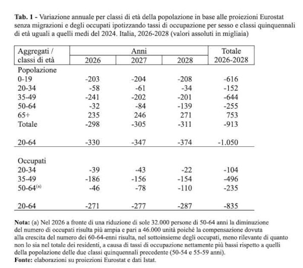Appare opportuno fare prima di tutto una valutazione generale sulle cifre previste dal Decreto Flussi 2026-2028, tenendo conto del potenziale fabbisogno di lavoratori provenienti dall’estero per il triennio di programmazione. Quasi 500.000 posti complessivi non sembrano pochi, ma si ridimensionano notevolmente se escludiamo dal computo i quasi 270.000 lavori stagionali, che potrebbero, in un’ipotesi limite, essere gli stessi posti destinati agli stessi migranti che tornano di anno in anno. In ogni caso, si tratterebbe di una questione di turn-over. Ci dobbiamo quindi chiedere se da un punto di vista demografico è sufficiente prevedere annualmente l’arrivo di 76.850 lavoratori provenienti dai paesi non appartenenti all’UE nel triennio 2026-2028?. Per provare a rispondere a questa domanda si può fare ricorso alle proiezioni Eurostat della popolazione residente in Italia nell’ipotesi di saldi migratori nulli. Le proiezioni considerate non tengono conto di quanto effettivamente successo nel biennio 2023-2024, ma questo dovrebbe incidere poco sulla riflessione che si intende qui proporre. Secondo le stime Eurostat tra l’inizio del 2026 e l’inizio del 2029 la popolazione residente dovrebbe ridursi di oltre 910.000 persone, all’incirca 300.000 residenti in meno all’anno con cifre crescenti nel tempo (tab. 1). Gli under 20 diminuirebbero di quasi 620.000 unità, mentre gli over 65 aumenterebbero nel triennio di oltre 750.000 persone, con il conseguente ulteriore invecchiamento della popolazione. La fascia di età lavorativa (20-64 anni) subirebbe quindi una perdita di circa 1.050.000 individui, di cui 330.000 nel 2026, meno di 350.000 nel 2027 e quasi 375.000 nel 2028. Supponendo che i tassi di occupazione distinti per sesso e classi quinquennali di età rimangano costati ai livelli medi del 2024, è possibile valutare la diminuzione nel prossimo triennio del numero di lavoratori di 20-64 anni per effetto delle tendenze demografiche in atto. Appare evidente che si tratta di un puro esercizio, capace però di dare indicazioni di massima sulla potenziale necessità del mercato del lavoro e sulla corrispondenza tra il probabile fabbisogno esterno di lavoratori e la programmazione dei flussi per lavoro. Secondo quanto supposto, il numero di occupati si ridurrebbe nel periodo 2026-2028 di circa 835.000 unità, con una diminuzione di circa 270.000 nel primo, meno di 280.000 nel secondo e quasi 290.000 occupati nel terzo anno. La perdita più consistente riguarderebbe la fascia d’età centrale, seguita da quella meno giovane e quindi da quella più giovane (tab. 1).